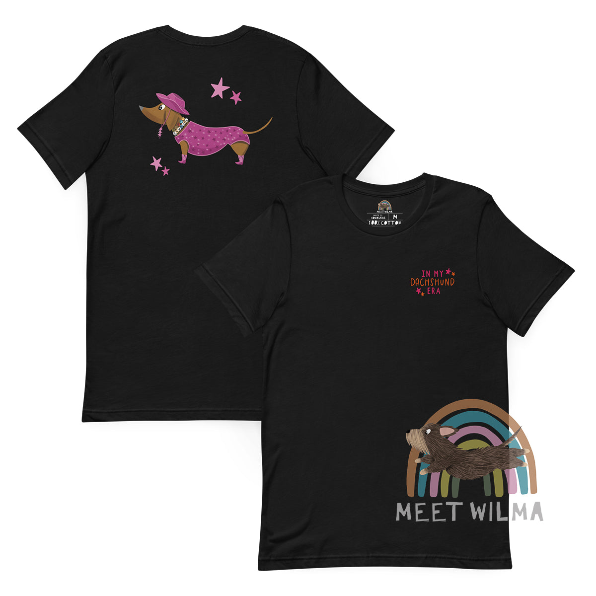 This shirt features "In My Dachshund Era" embroidery on the front-left chest and a print of the illustration with a brown Dachshund on the back.
