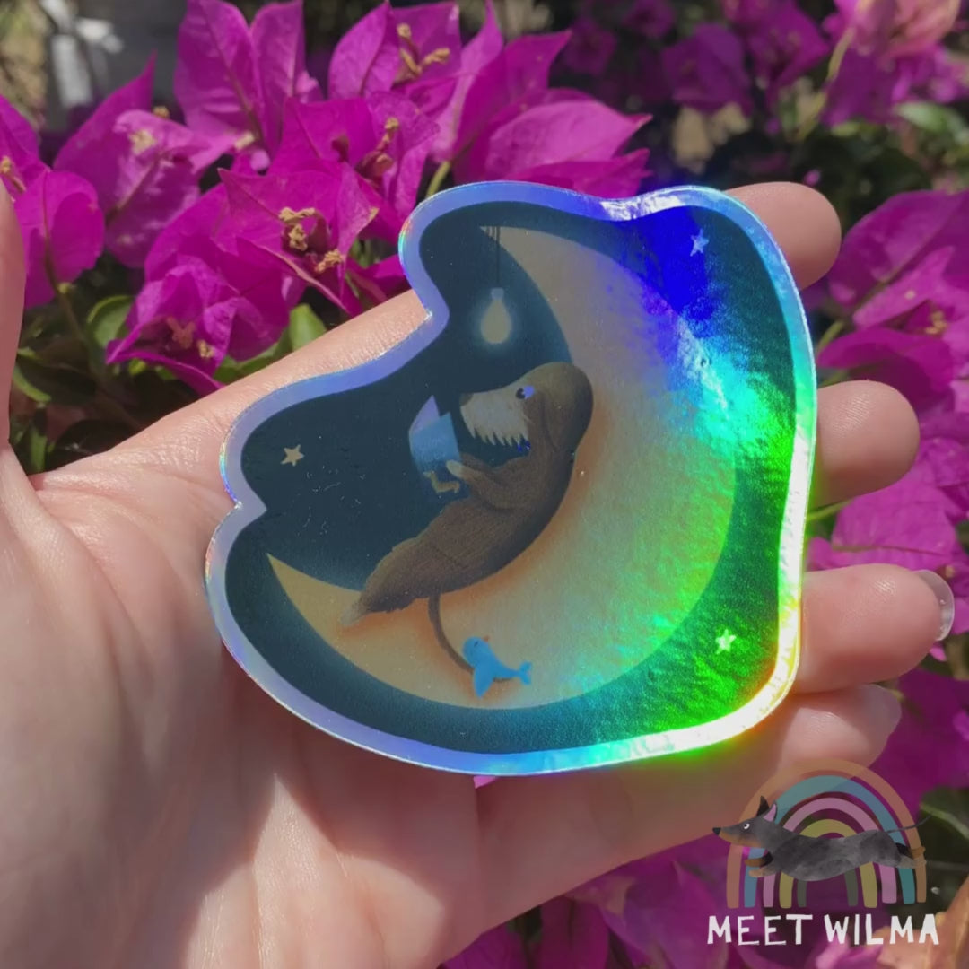This durable holographic Dachshund sticker "Bookworm" is a perfect decoration for your laptop, your notebook, or your phone case.