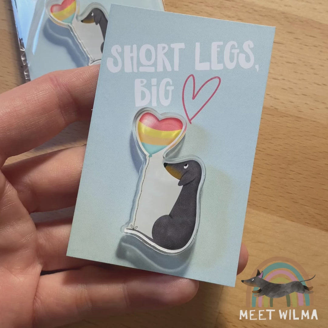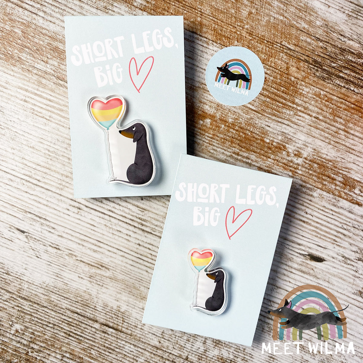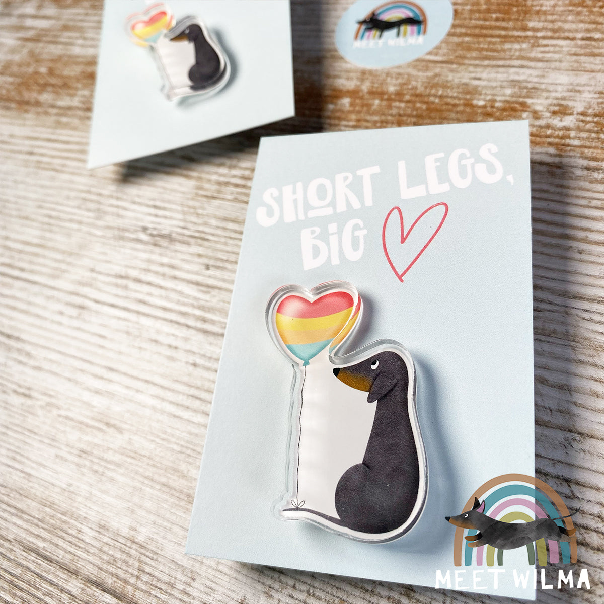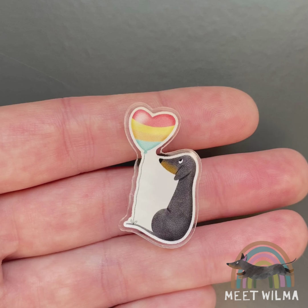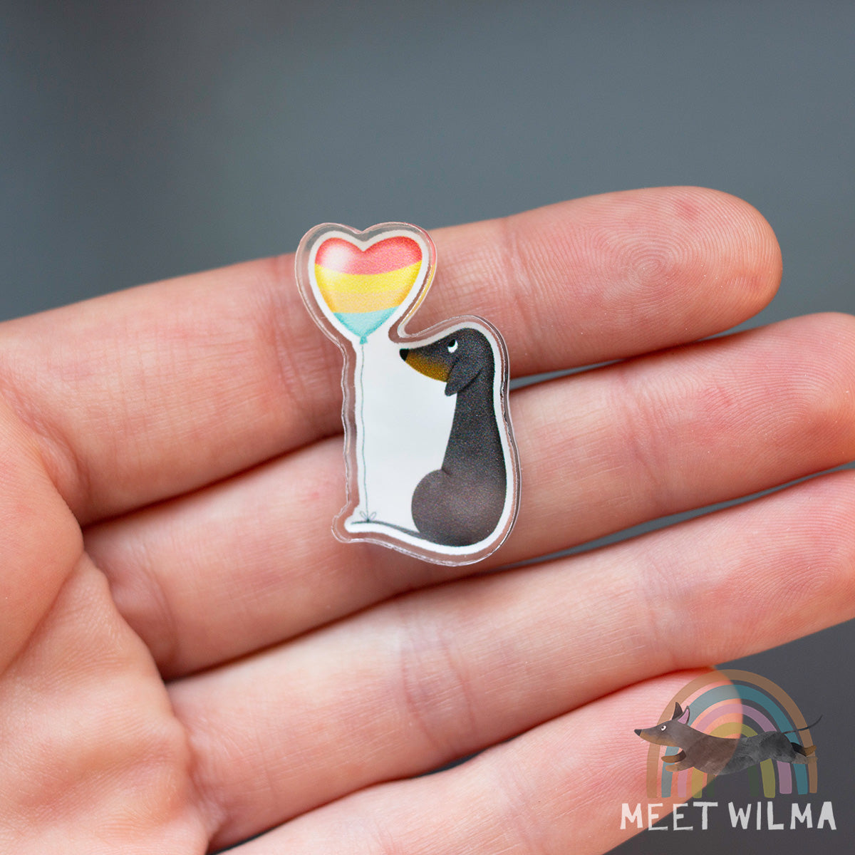 Dachshund Acryl Pin "Balloon" - a cute dog acryl pin in the shape of a Wiener Dog with a rainbow-colored balloon. A perfect gift for Doxie lovers!
