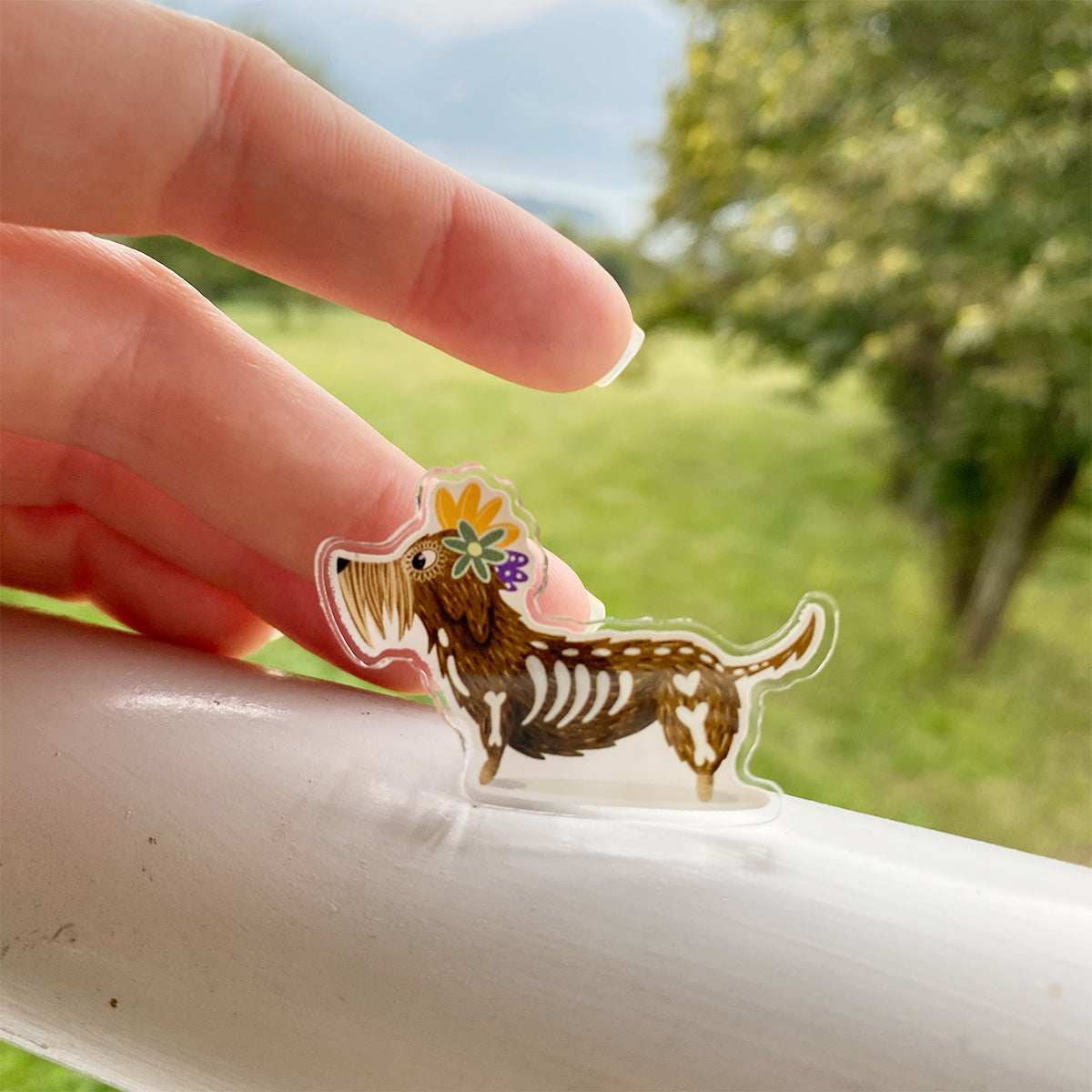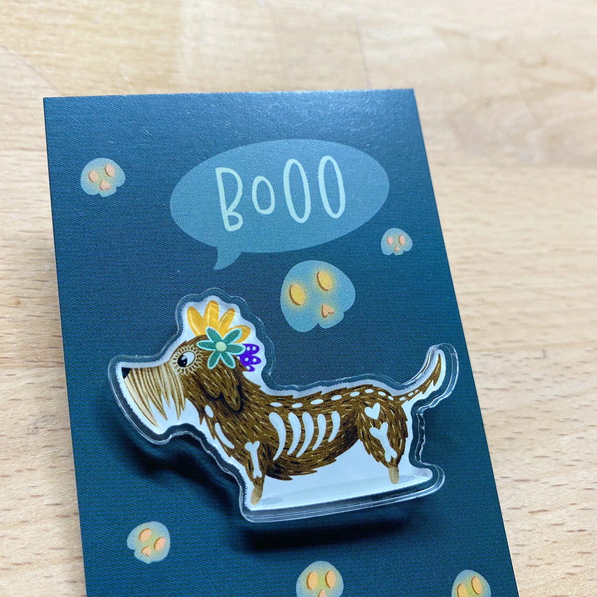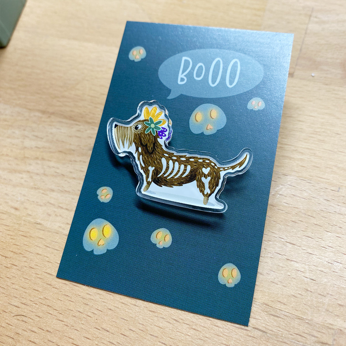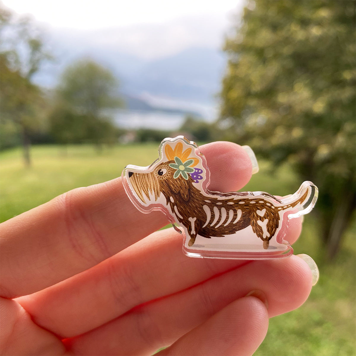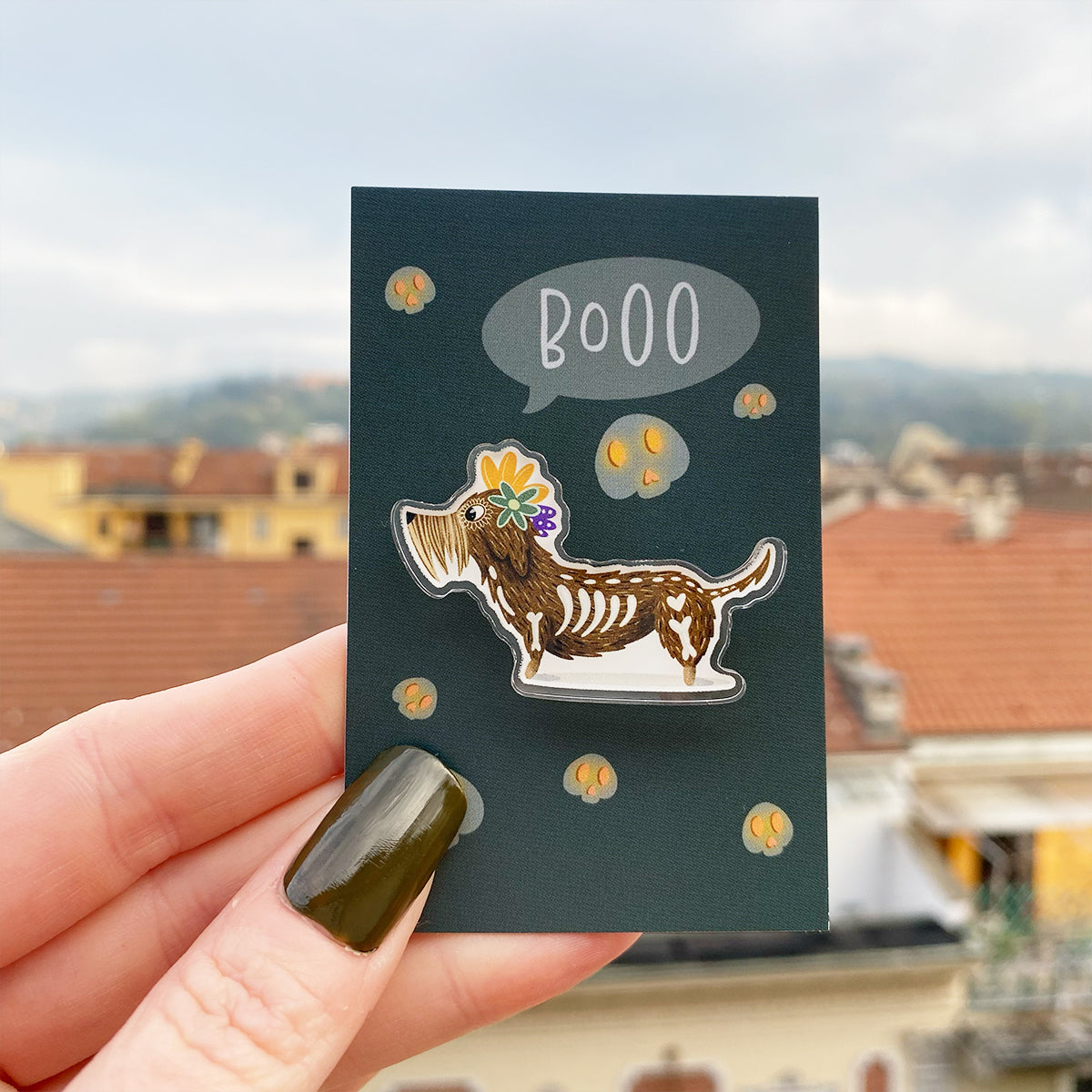 This wire-haired Dachshund pin “Muerta” isn't only for the Halloween season but also a cute accessory through the year.