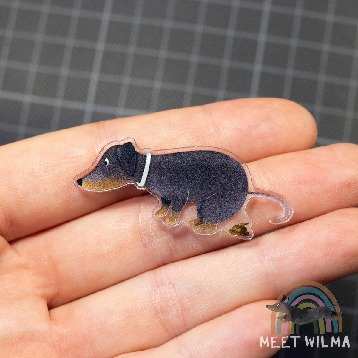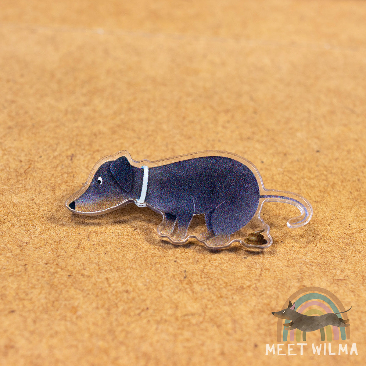 Dachshund Acryl Pin "Poop" - a cute dog enamel pin in the shape of a pooing Wiener Dog! A perfect and funny gift for Doxie lovers!