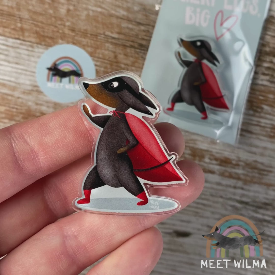 A cute acrylic dog pin that helps you to save the world. Available as Black and Tan or wire-haired Dachshund version. A perfect gift for Doxie lovers!