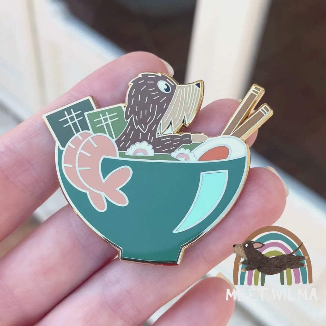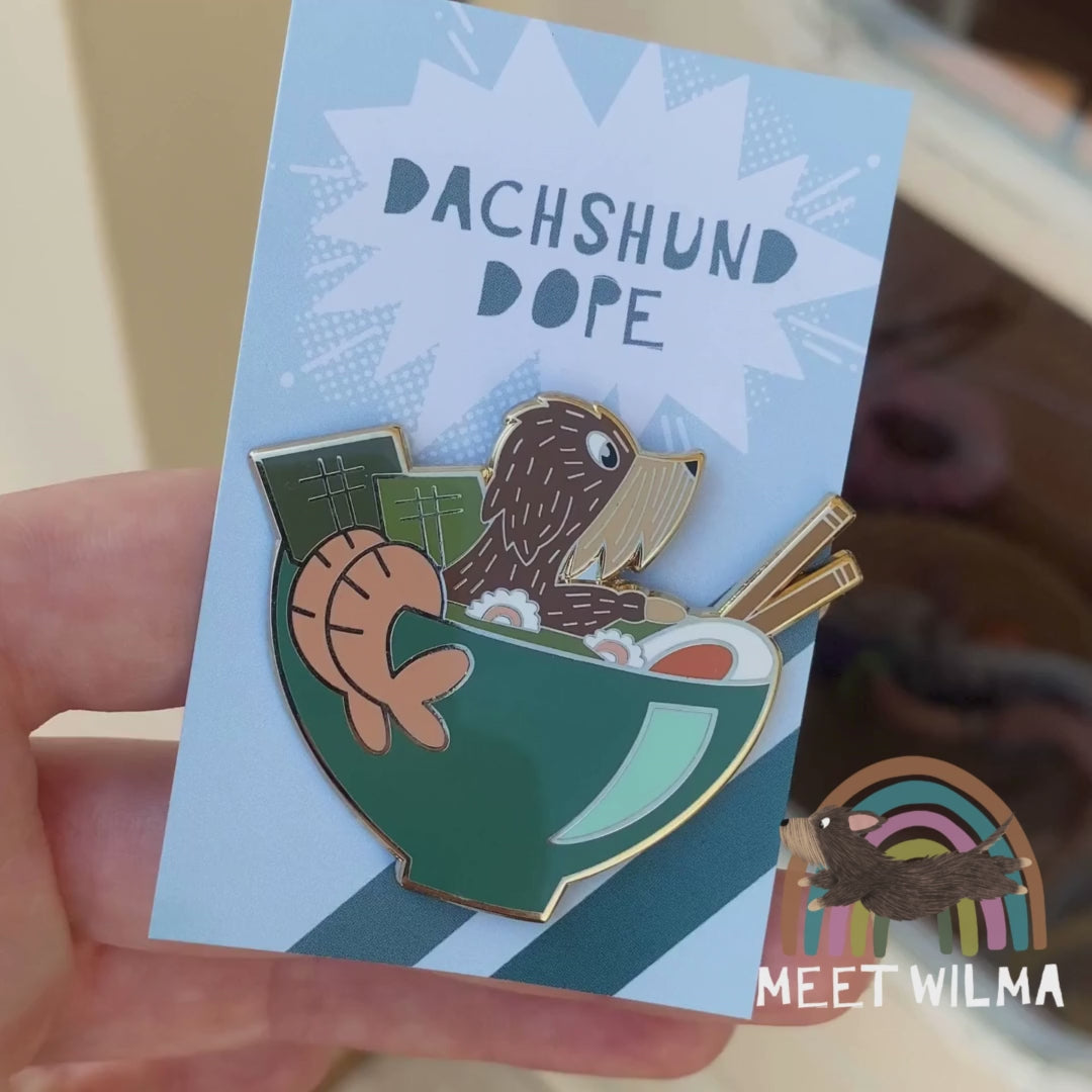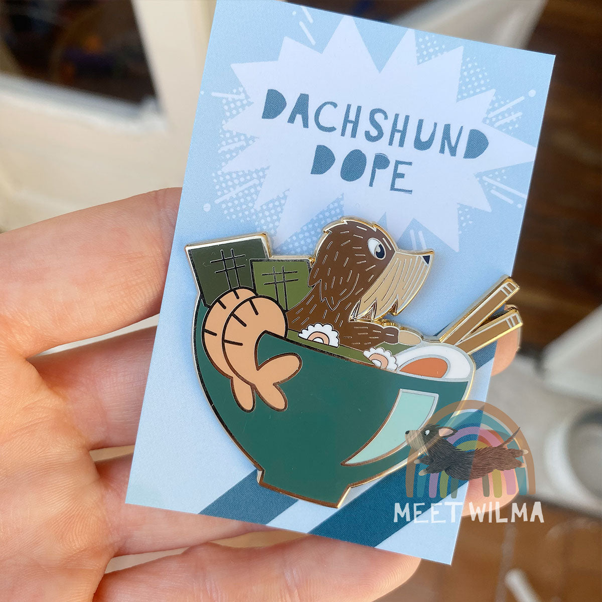 Here comes a new and super cute wire-haired Dachshund hard enamel pin. One of our illustrations was the blueprint for this pin and the transferred details are fantastic.