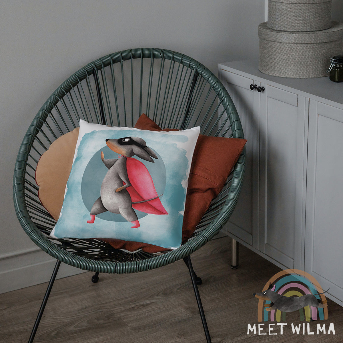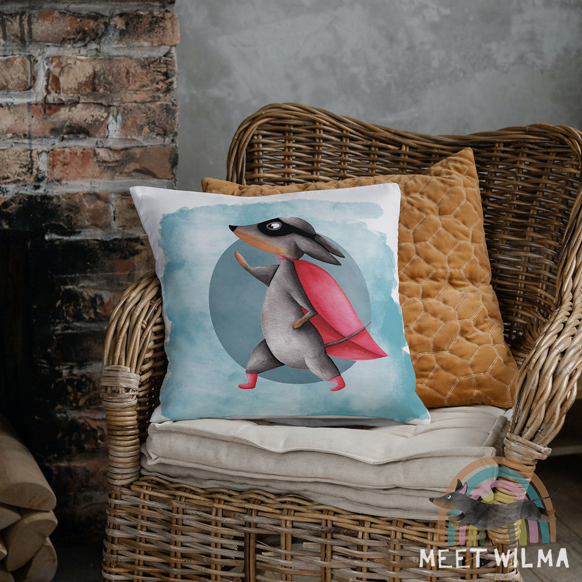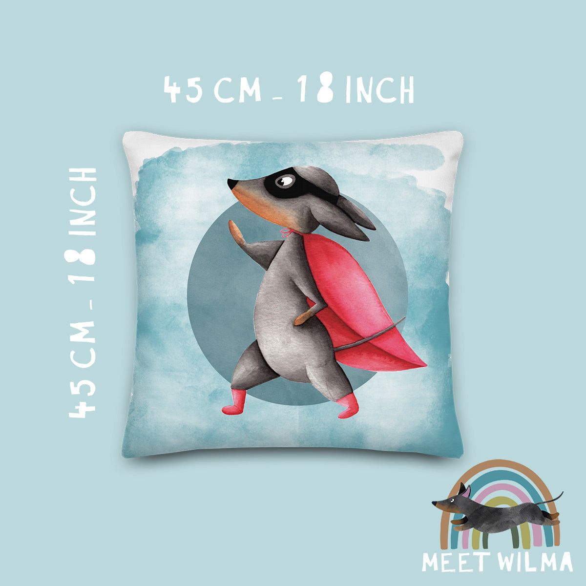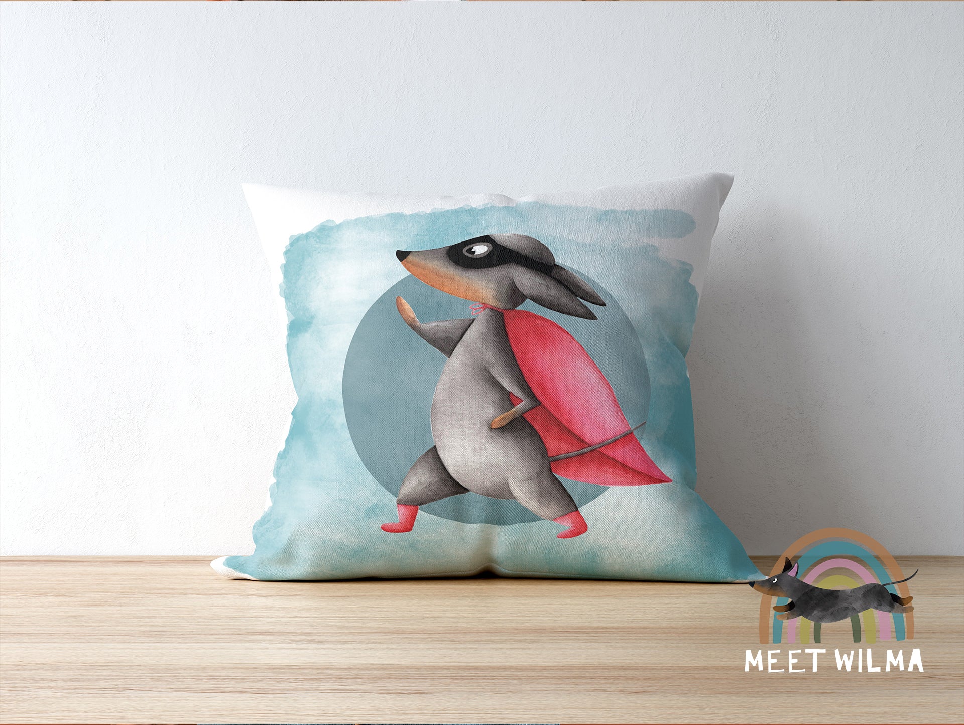 This cute Dachshund pillowcase "Superdachshund" is made from hand-drawn artwork with watercolors. The texture of the original watercolor painting is preserved and makes this pillow super unique.