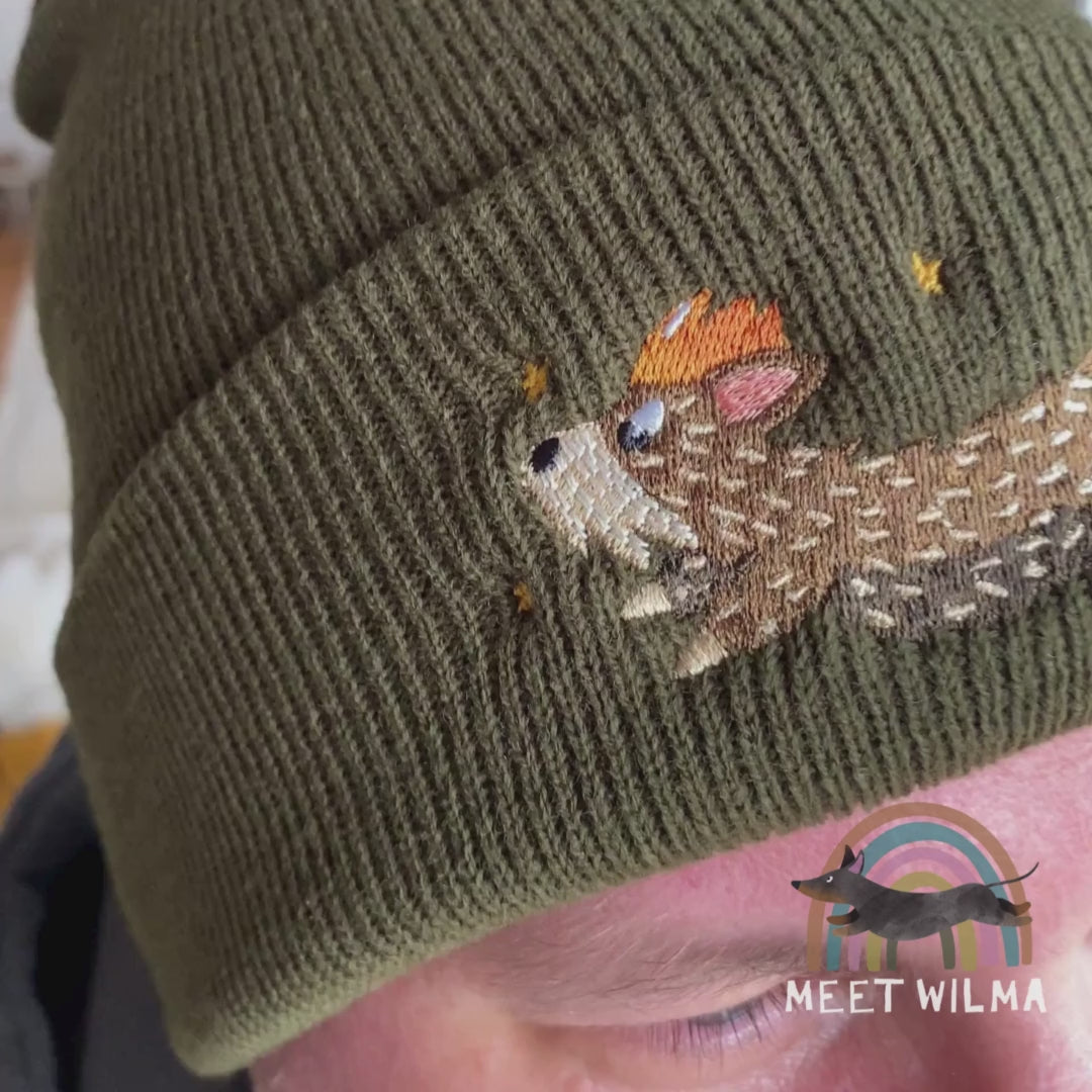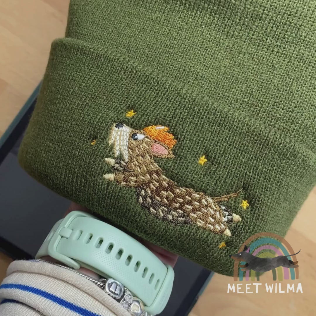 Head-warming and cute. This cuffed Beanie comes with a cute wire-haired Dachshund embroidery.